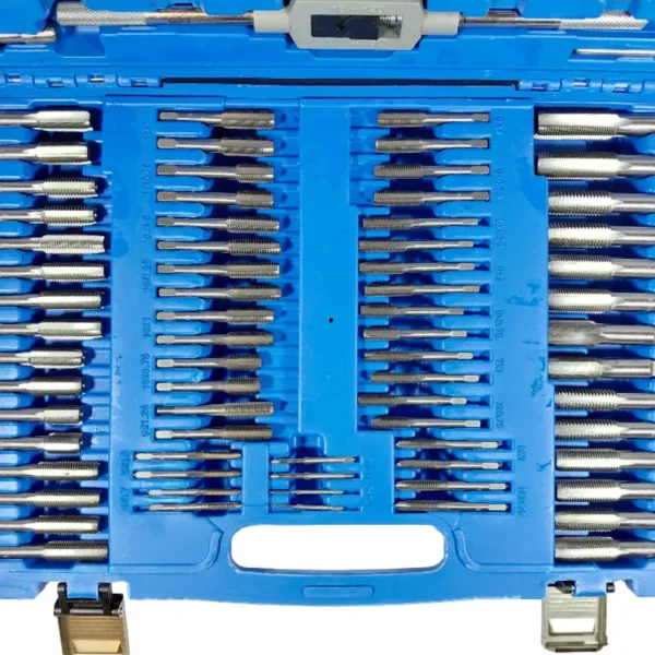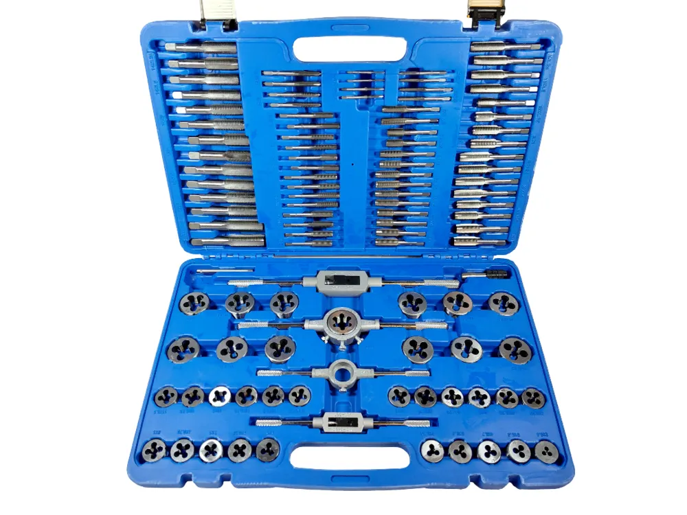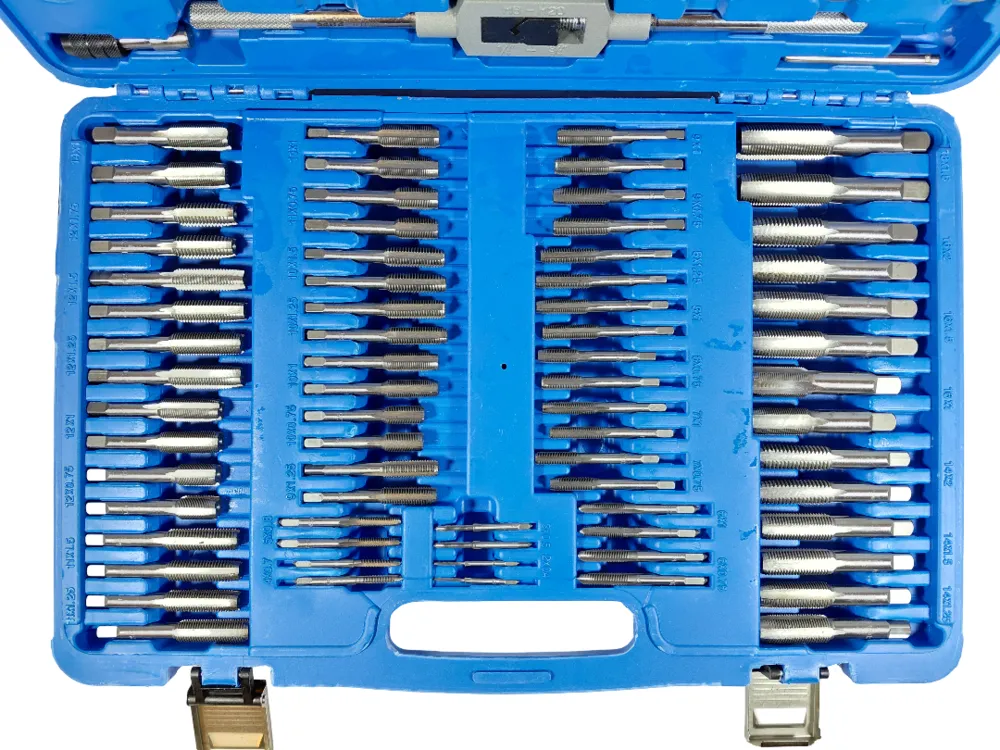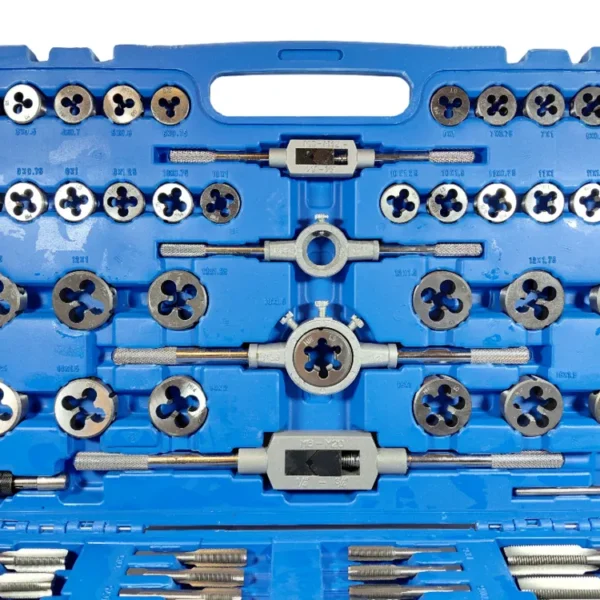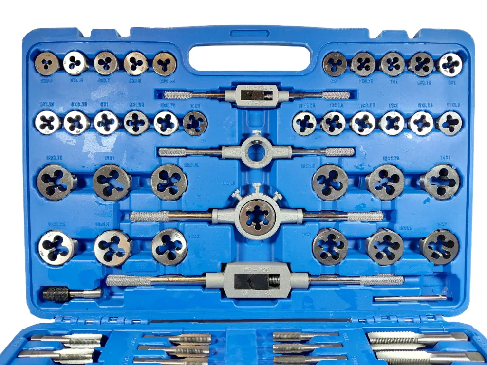 - 110 teiliges Set mit Gewindebohrern und Gewindeschneidern in verschiedenen Größen und Steigungen (Regelgewinde und Feingewinde)